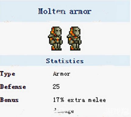 熔巖套是困難模式前(肉山前)防御力最高的裝甲,嗯一如既往的,還是近戰套裝,你一個遠程要那么多防御力干啥……